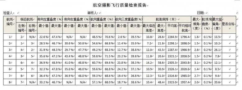 6.输出标准的航线统计报告,包括弯曲度、最大最小重叠度、最大倾角、最大旋偏角、航高保持情况等;
