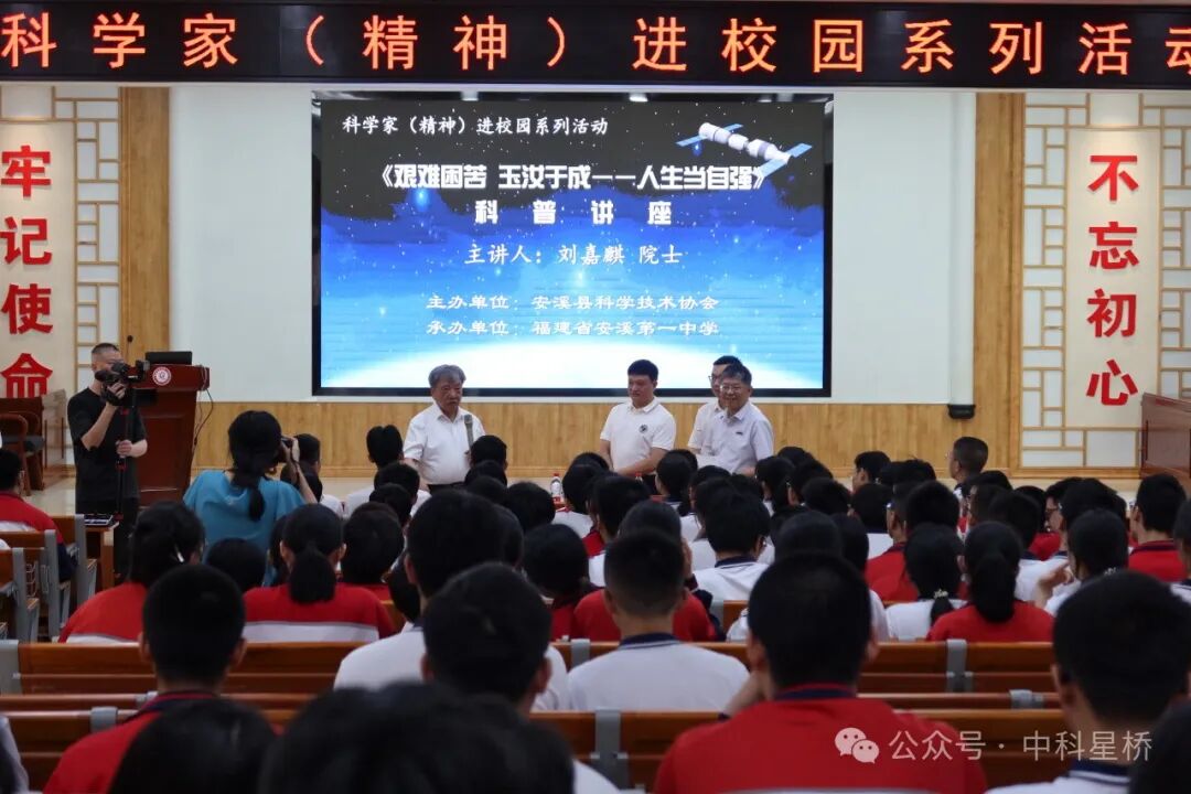2024年5月28日上午,中国科学院院士、我国权威地质学家刘嘉麒莅临安溪县第一中学参加“科学家精神进校园”活动并演讲授课。安溪县科协主席徐朝根、安溪县科协副主席谢秋娥、泉州中科星桥空天技术有限公司副总经理李鑫陪同,活动由副校长刘振强主持。