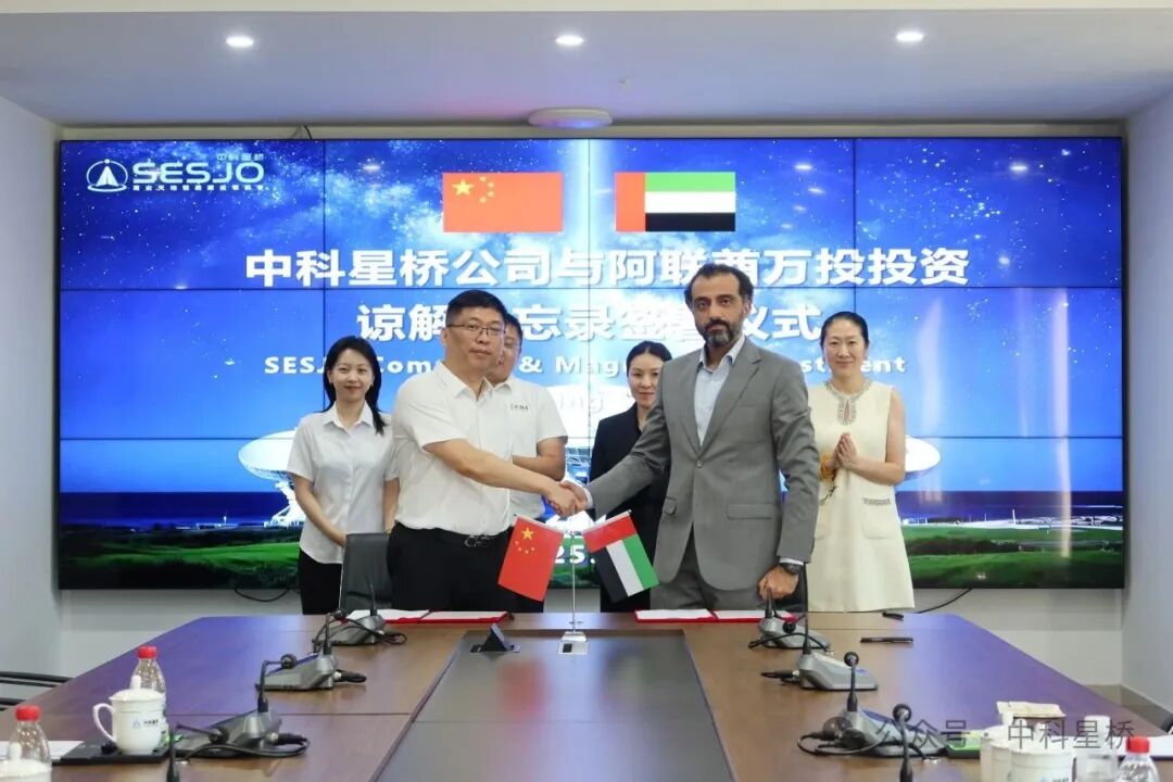 Multi Gold集团主席对中科星桥取得的瞩目成绩表示高度赞赏,并对中科星桥展现出的前沿技术实力和高效运营能力给予了充分肯定。 考察结束后,双方围绕天地链路、遥感星座、激光通信、低空产业多个具有战略意义的前沿技术领域展开了深入且富有建设性的会谈和交流。 尹大利董事长向H.E. Mohamed O. G. Alobeidli主席介绍了中科星桥的发展历程、主营业务、核心竞争力以及商业模式,并就中科星桥的全球站网布局计划和海外业务拓展进行了全面阐述,希望双方在平等互利、合作共赢的原则基础上深入开展合作,共同推动两国商业航天和数字经济高质量发展。 H.E. Mohamed O. G. Alobeidli主席表示,中科星桥是中国商业天地链路建设的领军企业,具备高速发展的活力和广阔的商业前景,是Multi Gold集团重点关注的企业。希望中科星桥能够发挥自身优势,充分对接国际市场,促进阿联酋在空天地一体化领域的发展。 双方一致认为,在空天技术迅猛发展的时代背景下,中科星桥的技术优势与Multi Gold集团的全球视野及资源网络具有广阔的合作空间。 会谈结束后,中科星桥董事长尹大利与Multi Gold集团主席H.E. Mohamed O. G. Alobeidli签署谅解备忘录,双方确立了战略合作关系。 本次与中东投资机构的合作是中科星桥国际化战略的又一重要里程碑,为未来在“一带一路”沿线国家和地区推动空天大数据应用和空天地一体化建设奠定了坚实的基础。双方将以此为契机,建立常态化沟通机制,共同推进和落实具体合作项目,为全球用户提供更优质的空间信息服务,携手构建空天科技高地,打造科技创新引擎,共赢空天经济新时代!