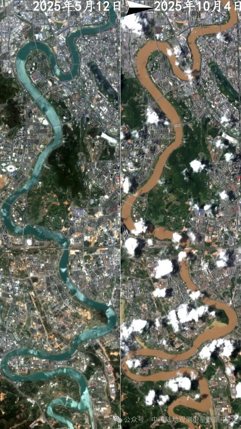 中国资源卫星应用中心在广西洪水发生初期立即启动重大自然灾害应急响应机制,第一时间为救援提供卫星图像信息,为灾害救助提供支持,以下为广西部分地区洪水过境前后影像。